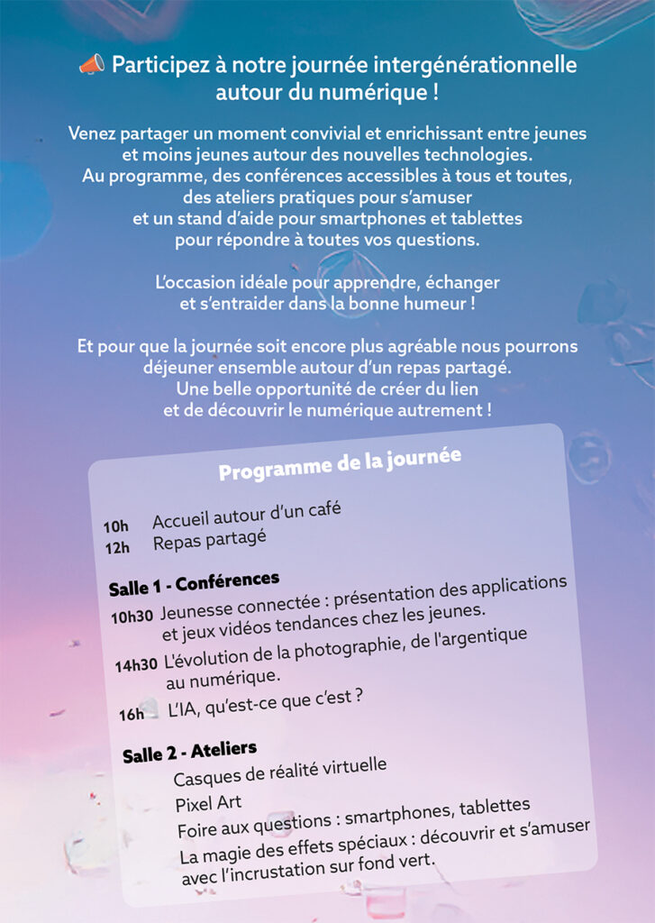 Au programme de la journée : 3 conférence d’une heure sur jeunesse connectée, évolution de la photo de l’argentique au numérique, l’IA qu’est-ce que c’est ? Mais aussi des ateliers : la magie des effets spéciaux, casques de réalité virtuelle, pixel art, foire aux questions et échanges autour des smartphones et des tablettes…