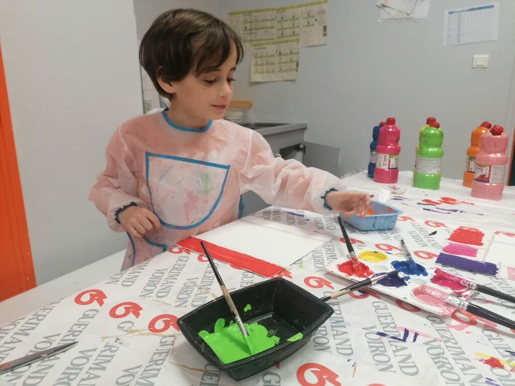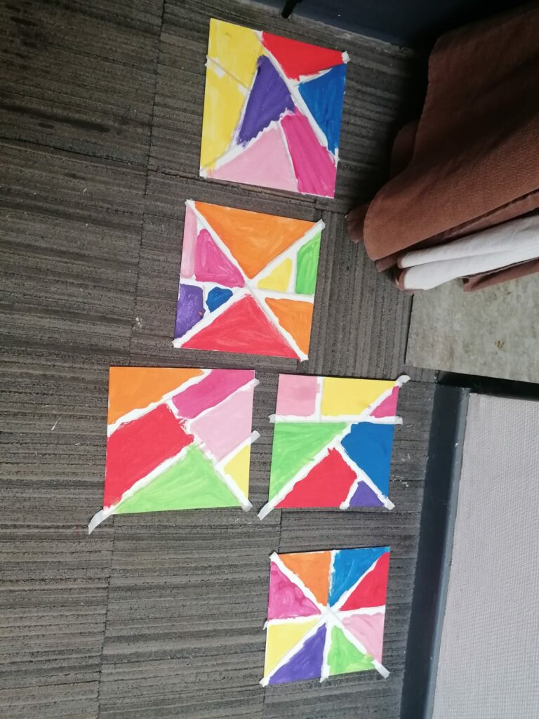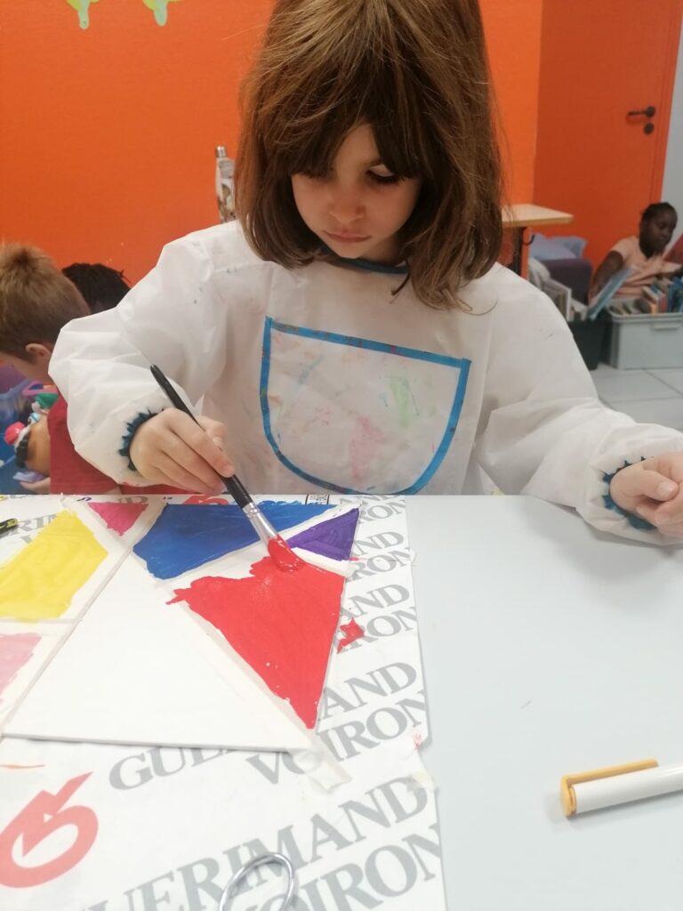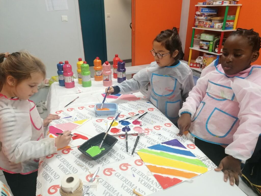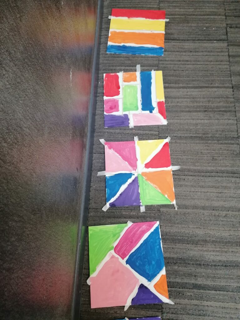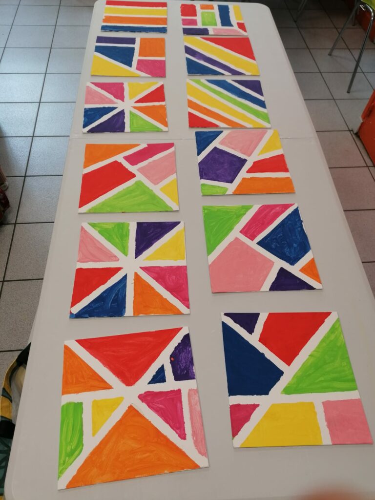 Retour chez les 6-7 ans (groupe des Tournesols) qui ont expérimenté une technique de peinture : sur une toile les enfants ont apposé du scotch de masquage, puis ils ont peint entre les bandes avant de les enlever une fois la création sèche.