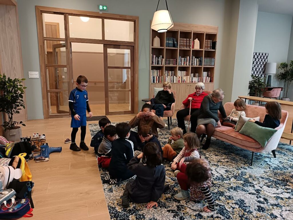 Fin du tour d’horizon des crêpes-parties « enfants-séniors » du mercredi 4 février à l’Espace Boris Vian avec le groupe des 3-5 ans accompagné de Laura, Élise et Romain à la résidence séniors Les Jardins d’Arcadie Libération…