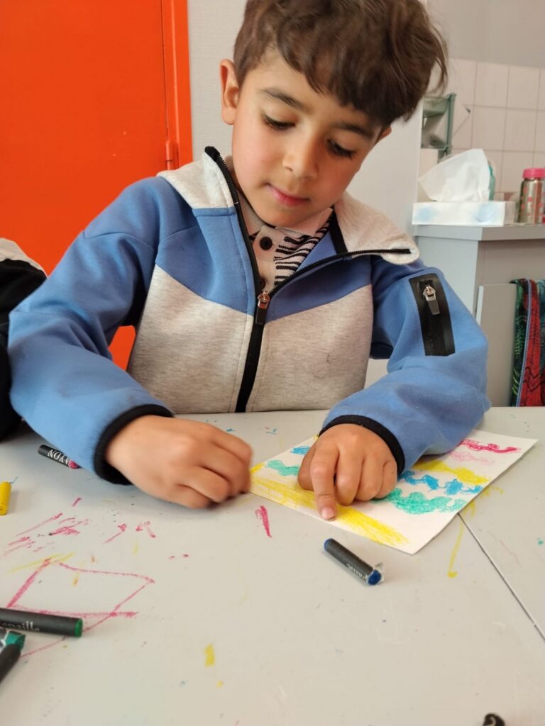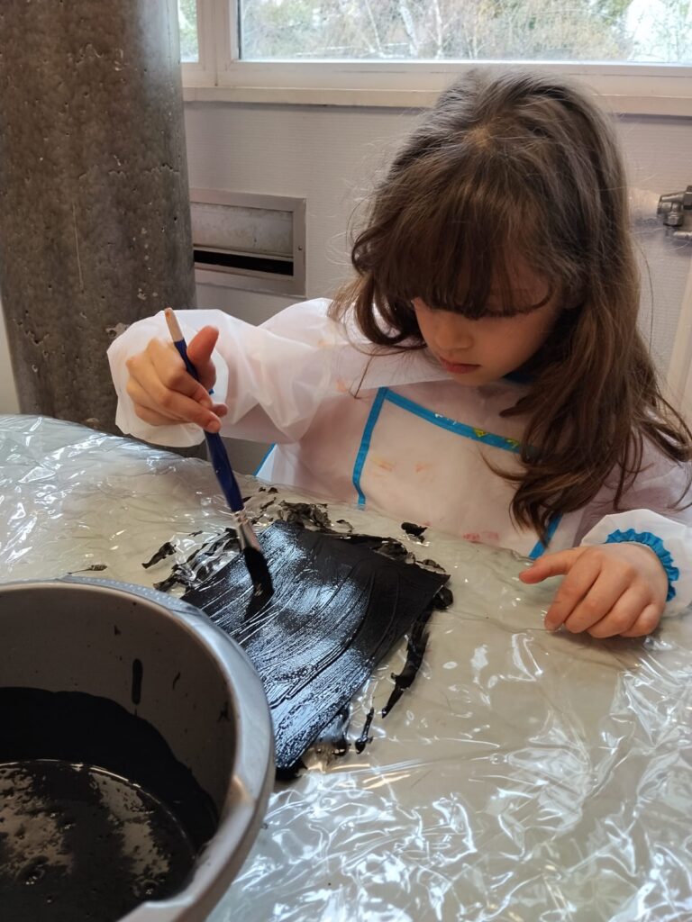 Le principe c’est que les enfants utilisent des craies grasses pour mettre en couleur la feuille de papier et ensuite ils la recouvrent avec de la peinture acrylique mélangée avec du produit vaisselle ![]()
