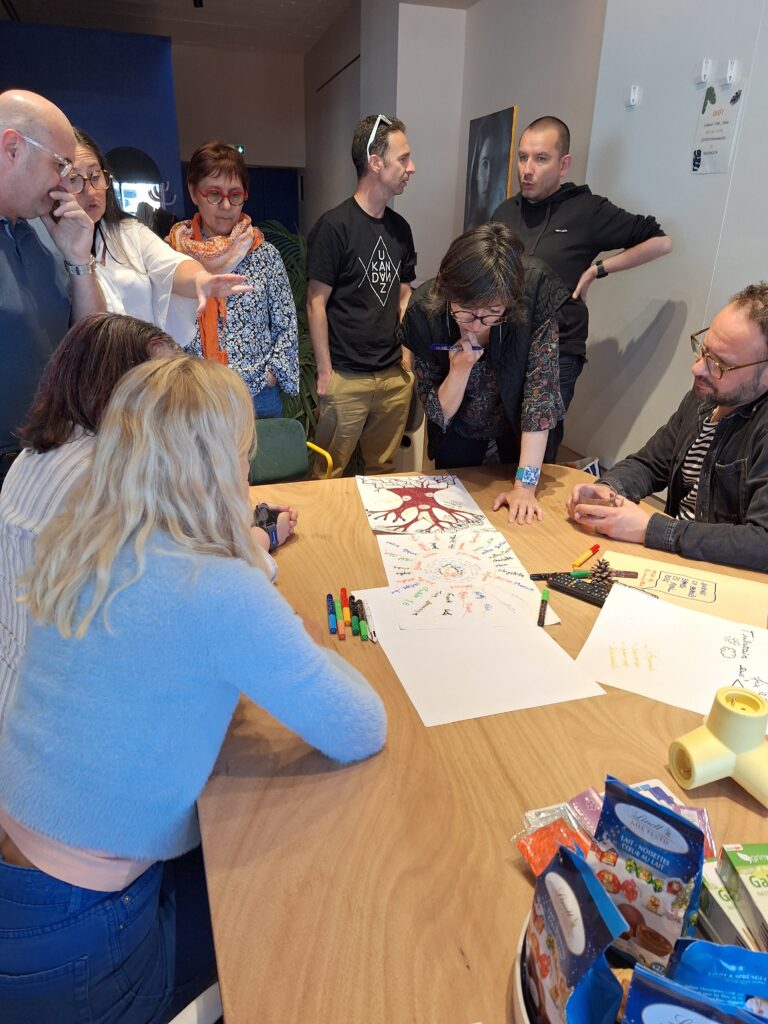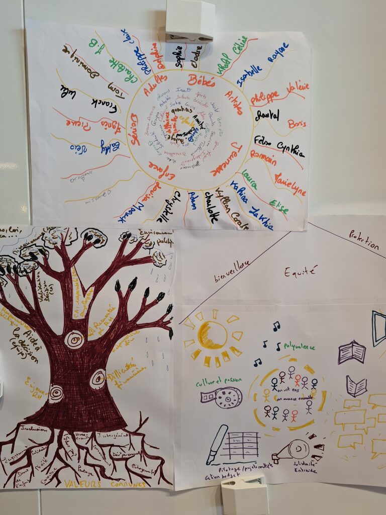 Du coup de 9h à 15h, nous avons surtout joué (quizz sur le centre social, jeux de connaissances des uns et des autres) et échangé puis nous avons réalisé ensemble une affiche symbolisant l’équipe, la cohésion salariés-CA, le socle du centre social, sa force.