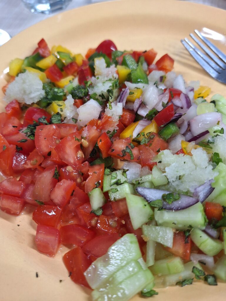 Le repas a été préparé par les bénévoles du Cabas et plus de 20 personnes ont pu venir déguster la salade concombre, 3 poivrons, tomates, oignons rouges avec huile d’olive et jus de citron, suivie des Lasbannes, recette kabyle de boulettes de semoule accompagnée d’agneau et de légumes.