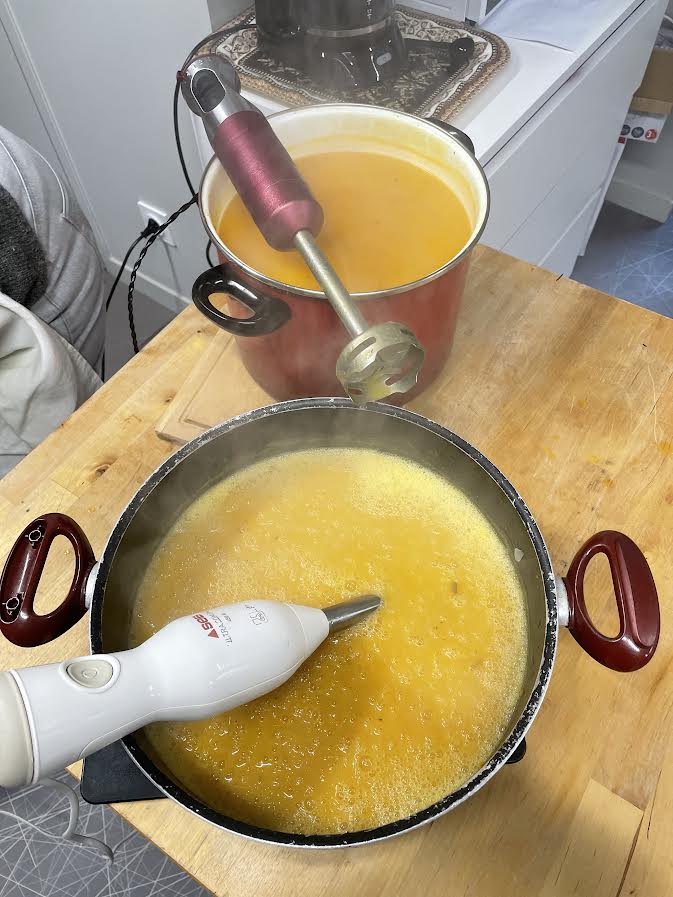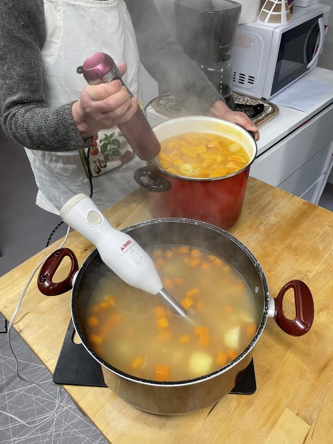 Les bénévoles ont passé la matinée à préparer les deux soupes pour le temps festif du lendemain sur la place Chavanelle (pommes de terre, carottes, oignons et pommes de terre, butternut, oignons)