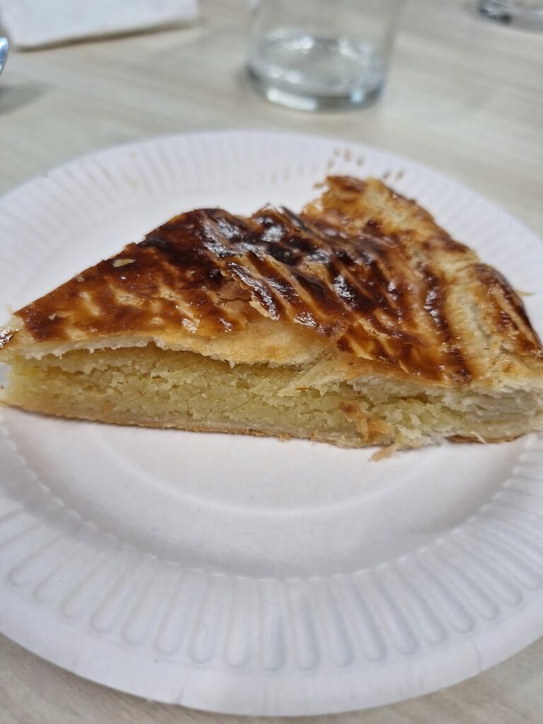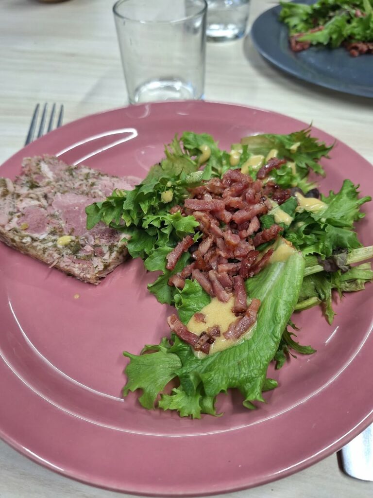 Un délicieux repas à 5€ par personne (toasts de rillettes d’oie, salade vert + lardons + jambon persillé, sauté de veau sauce champignons/carottes et riz, galettes frangipane ou poire-chocolat maison et meringues maison).