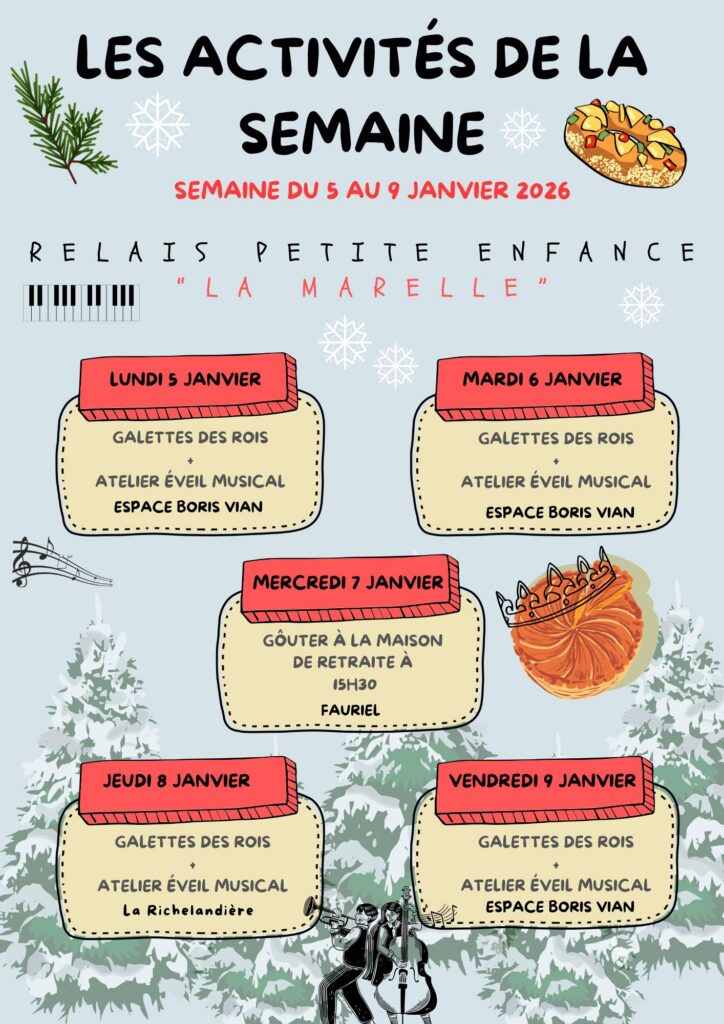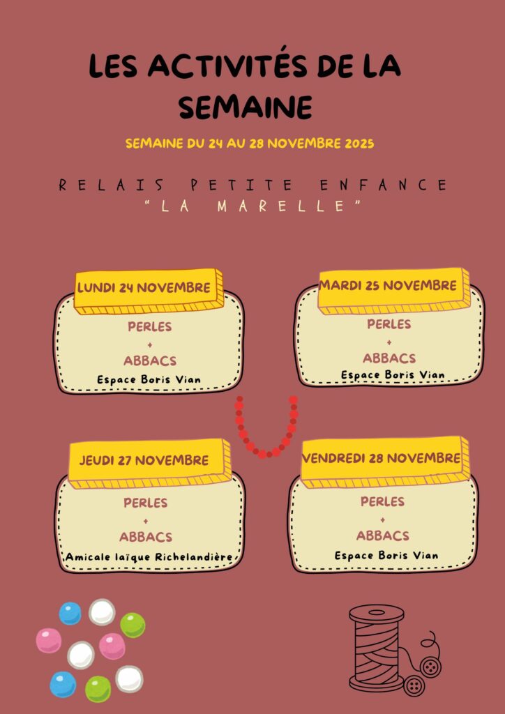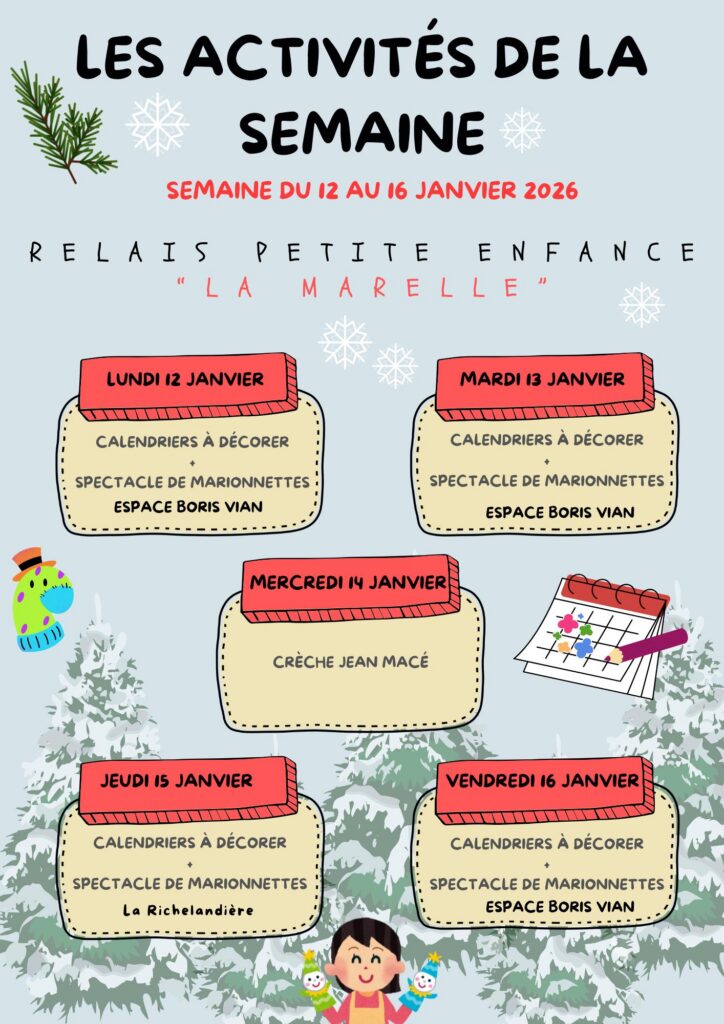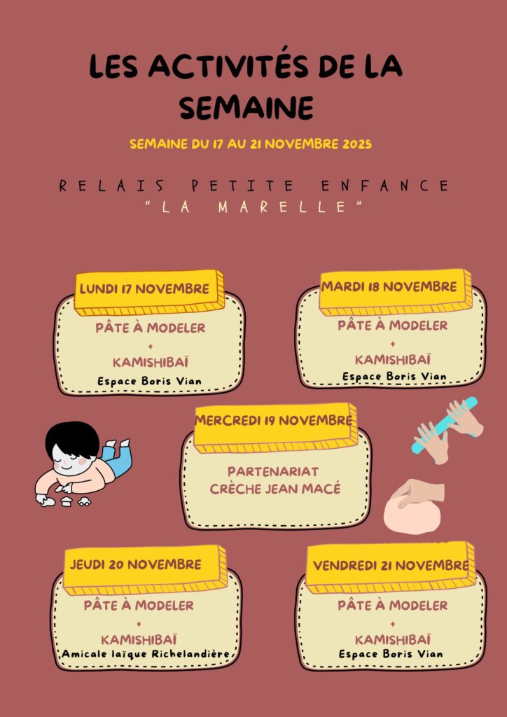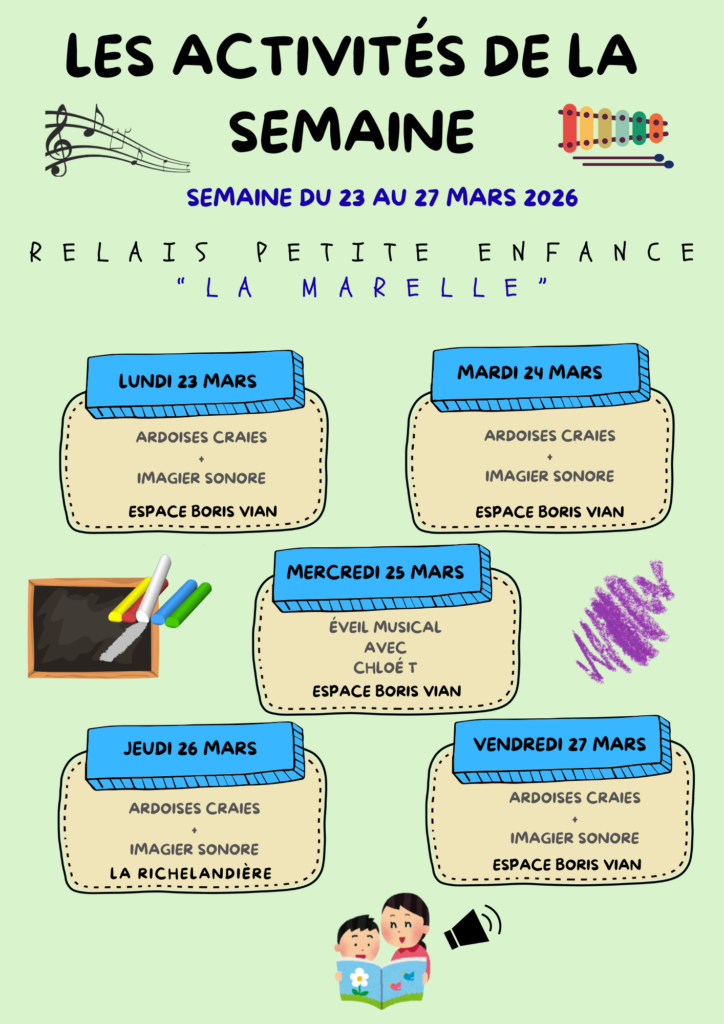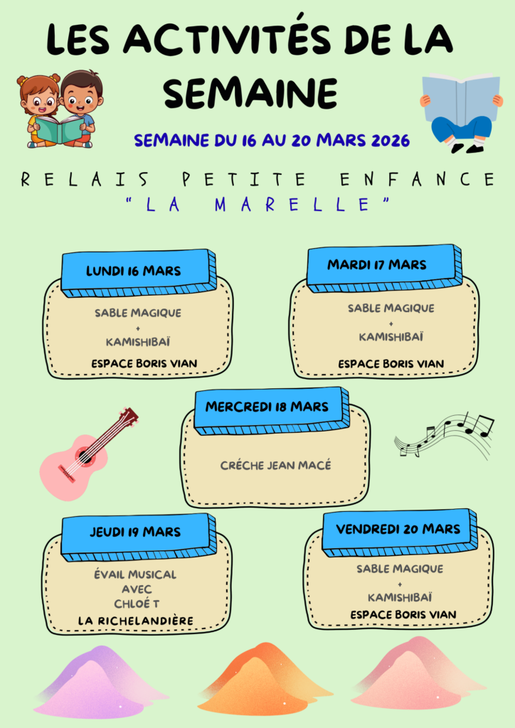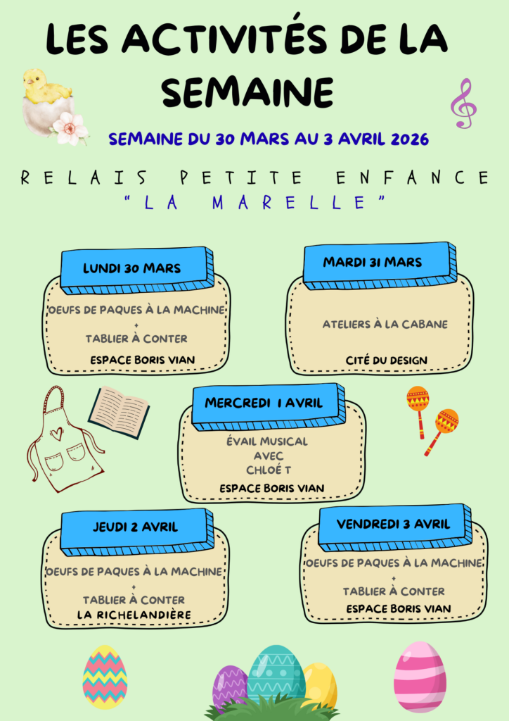Programme des temps d’animation collectifs proposés aux enfants et à leurs assistantes maternelles par le Relais Petite Enfance La Marelle de l’Espace Boris Vian pour le mois de juillet 2025