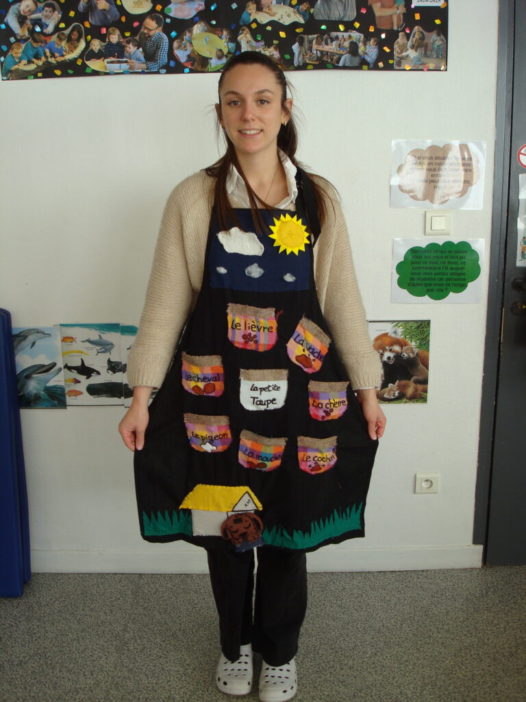 LE TABLIER À HISTOIRE « DE LA PETITE TAUPE QUI VOULAIT SAVOIR QUI LUI AVAIT FAIT SUR LA TÊTE DE NOTRE STAGIAIRE ÉDUCATRICE DE JEUNES ENFANTS MAËLISS